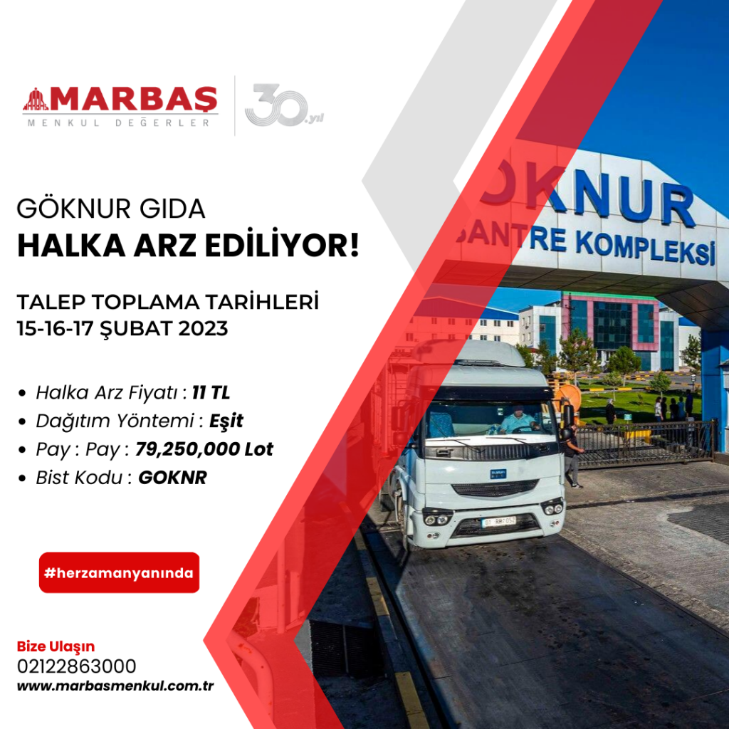 Göknur Gıda A.Ş. 15-16-17 Şubat 2023 tarihlerinde 11 TL fiyat ile halka arz edilecektir. Göknur Gıda Halka Arzında, Marbaş Menkul Değerler olarak konsorsiyum üyesi olarak yer almaktayız. Online şubemiz üzerinden […]
