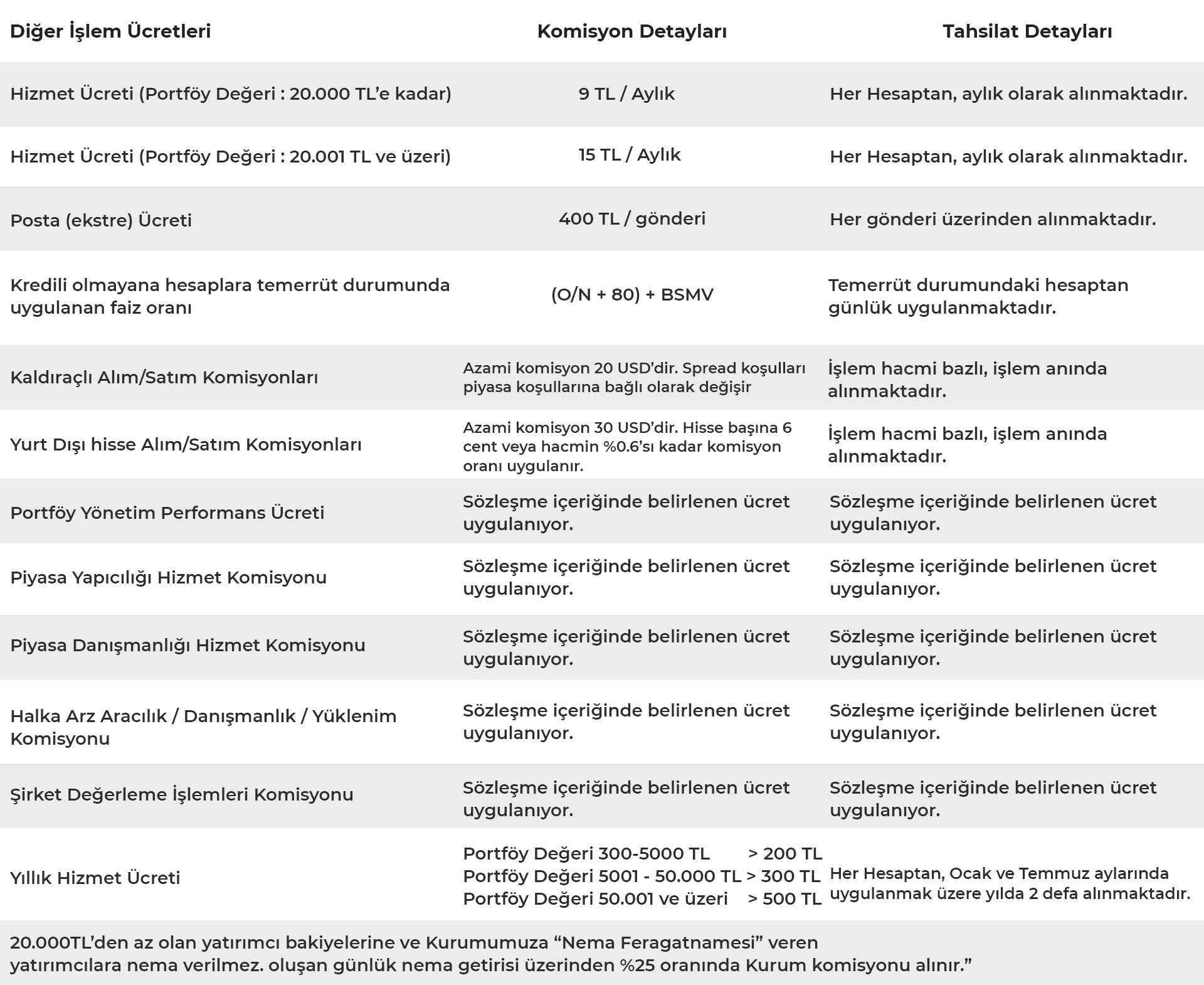 - Ücretlendirme Tablosu