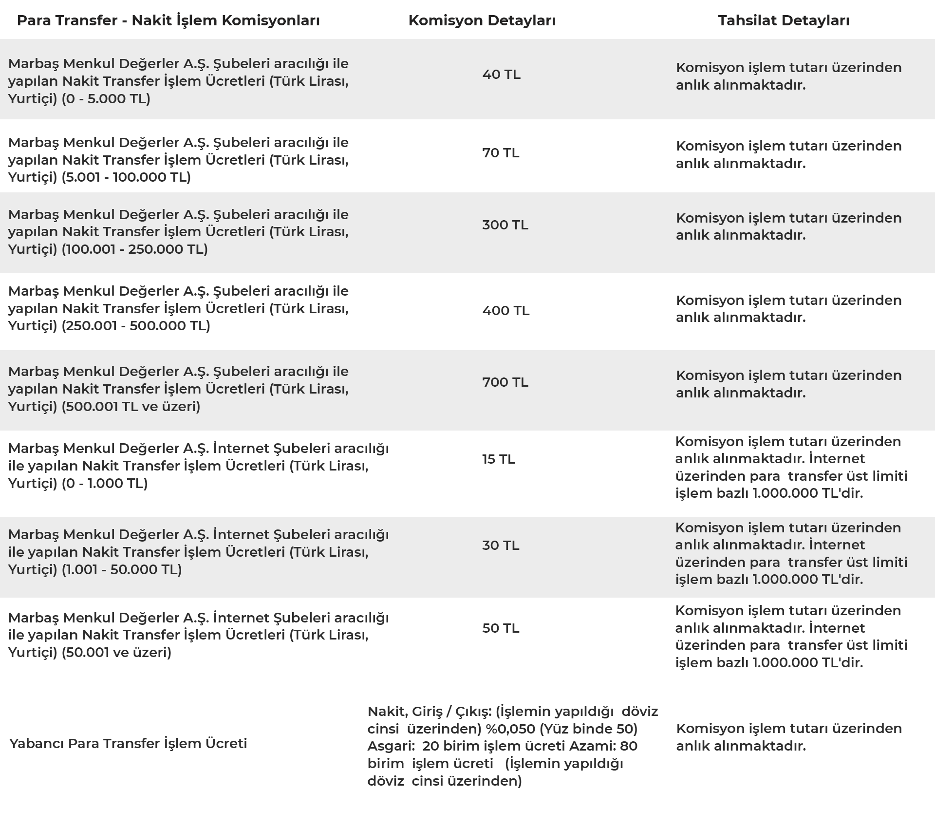 Para Transfer - Nakit İşlem Komisyonları